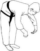 两脚分开站立屈膝下蹲然后屏气上体后倒收下颌在肩背触地的同时两手在体侧拍地(图161-163)。