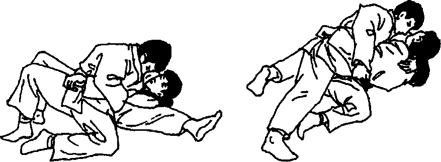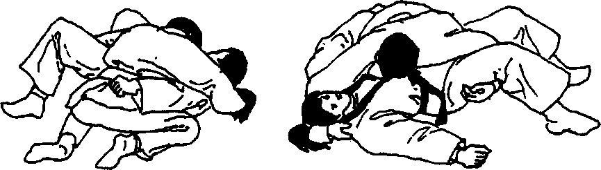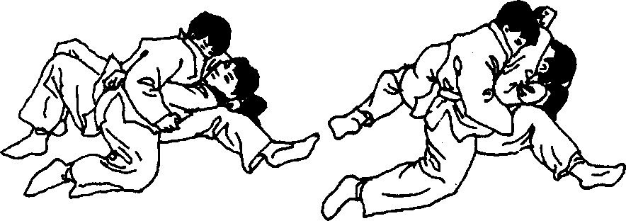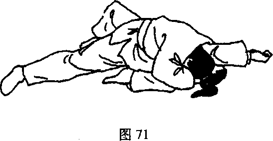 用左侧袈裟固固住对手,对手向右侧翻去成俯卧姿势,自 己从对方左腋下插入用左手抓住其右手,左手抓住其领,用身 体压住对手的同时使用送襟绞控制住对手(图73 )。