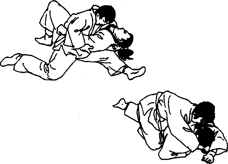 用左侧袈裟固固住对手,对手身体全力转向右侧,左肩向 右转,自己一边用力顶住对手,一边身体成俯卧姿势,右手抓 紧对手的后领,用横四方固控制住对手(图72 )。