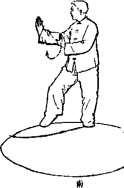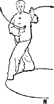 顼*平步登云*上动不停'上身不动*右脚向前上步,沿 圆弧稍内扣,面向(西方)圆弧走去。两脚平起平落,如蹬水状。 腊要紧,膝要抱,胯要坐,腰退齐动,治弧前进,俟前进四专 时,双掌即变为“凤飞翔”势(如上图M