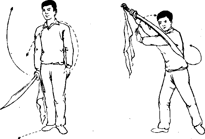 面朝前(南方)直立;两臂下垂,左手五指自然分开,指 尖朝下,右手的拇指与食指紧握刀柄护手盘处,其余手指 松握,刀尖朝前下,刀刃朝下;目向前平视(图1)。要点:头要端正,下颔内收,闭唇扣齿,舌顶上腭,两 肩松沉,含胸拔背,腰略下坐,精神贯注。图 1图 1图 2图 2图 1图 1图 2图 2