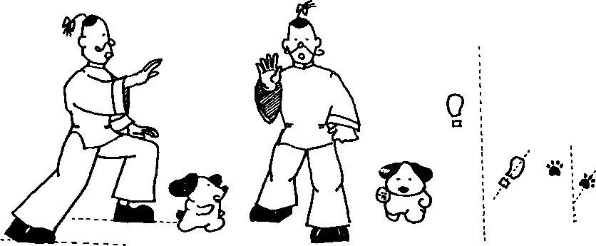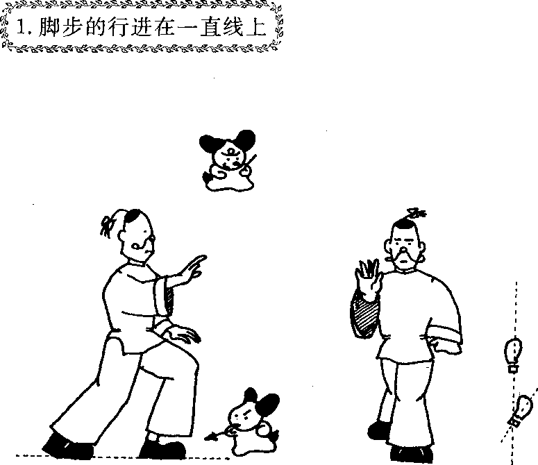 ?如左脚收起向前跨出一步时(见下图),左脚的脚跟应落在B 点;如落在A点,则与右脚在一直线上,就成为不稳定的弓步 了。要是左脚在I线的延长线上,右脚在n线的延长线上做上 E1H己,就容易掌握了。