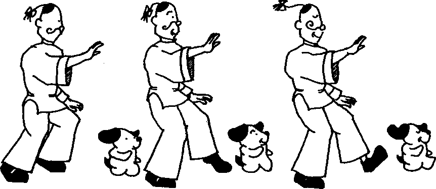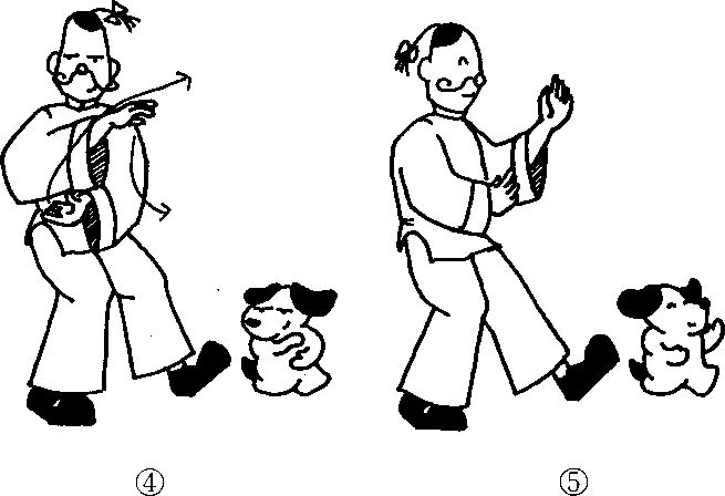 手抱着琵琶① ② ③①将右脚移近左脚跟,然后将身体重心移在右脚上;②左脚略向前迈出,脚尖踮地(脚尖虚步);③变为脚跟踮地(脚跟虚步);④腰右转,将左手贴近右手肘外侧挥出;⑤腰左转转回,左手高齐鼻尖,右手在左手肘部停下,如同抱着一把琵琶的形象(两手手心都向内侧)0