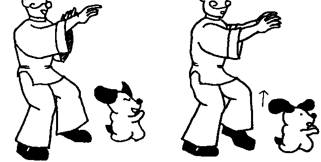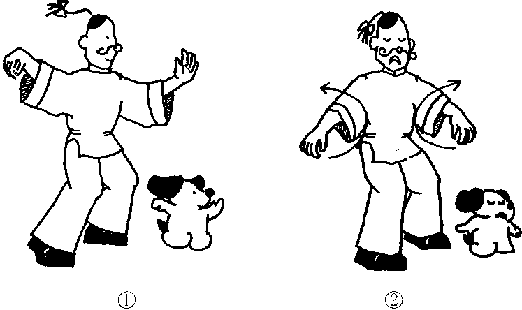 ②左脚脚跟提起,两手慢慢落下;
