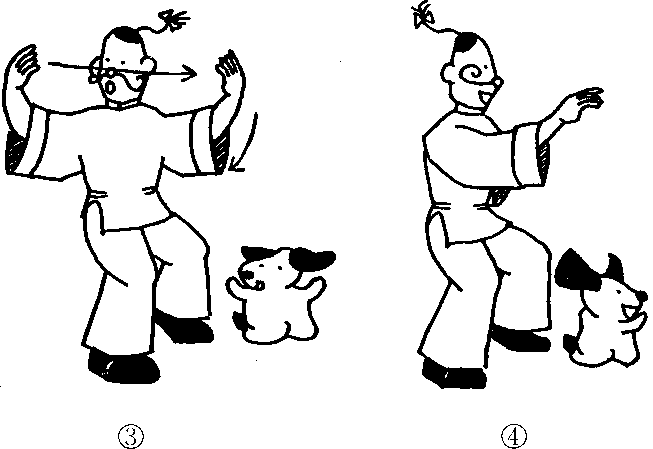 ①右脚收回半步,将身体重心移至右脚,一面将钩手放开;