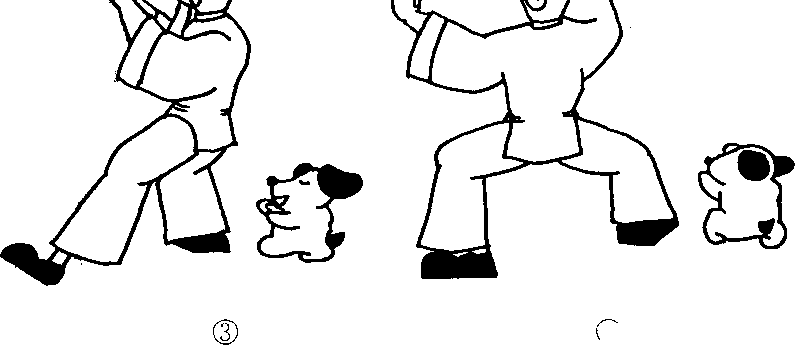 ① ②①随着右膝伸直,上身抬起,两手也同时提起;②将左脚提起,右脚独立;..33④④..33④④③将左脚向左斜方跨出,脚跟先着地; 、④身体重心移至左脚半蹲,两手分开;右手置于头侧,左手向前方 推出,目光看着推出的左手。信要点曾?注意右肩不要抬起。