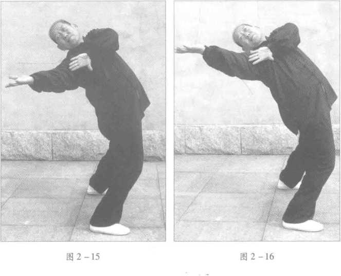 伸直,一正一反(左手正、右手反),手心朝外,以腰带动上身向左、向 后、向右、向前下逆时针转动,转到正位时,两手变为右手正、左手反, 然后反方向以腰带动上身向右、向后、向左、向前下顺时针转动,共计8 次。(图2-15、图 2-16)