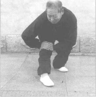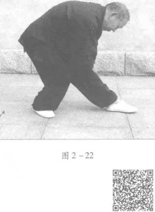 左式。两腿开立一肩宽,右 向前迈一大步后弯曲,大腿与小 腿呈90。,右腿伸直,上身面向 前方保持中正,两手抚左膝盖, 整个上身由百会至会阴垂直松坠 下压36次.右式换式时不可起 身,直接扭转为左式,其他动作 同左式D (图2-23)