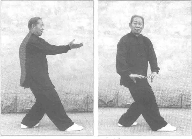 以老僧托钵起式,然后双手向里向下翻,同时身体向右拧转,双掌 随身体至右胯前,目视树,此为塌掌。(图4-16、图4-n)
