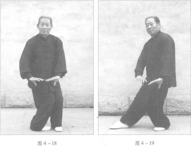 换式时,扣步抒身,双掌下塌,保持在内侧不变,然后继续行进走 转。(图 4-18、图4-19)