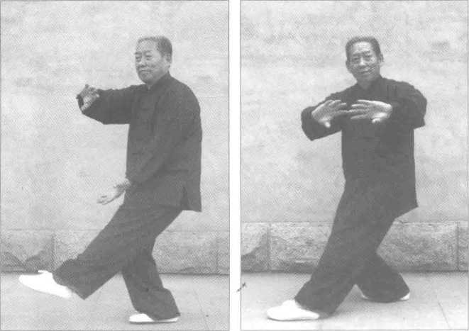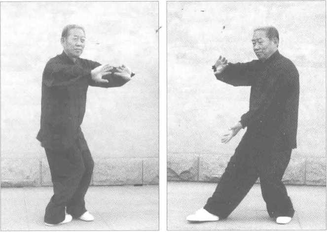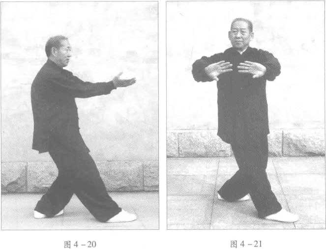 老僧托钵(为阳)起式,随走随变,两手向两侧平开,掌心向上, 两臂不能过肩,以合沉肩坠肘要求,不可过分外展,影响含胸拔背。展 开后屈肘,双掌合至耳后翻转指尖对耳,然后掌心向前平推,微低于肩, 里外形成圆形,十指相对。(图4 _2〇、图4-21)