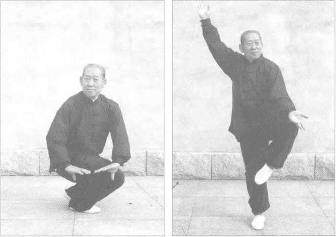 随左腿提起,左脚尖提于右脚跟筋骨穴处,随两手掌用滚按劲,左 手挑劲,右手压劲。