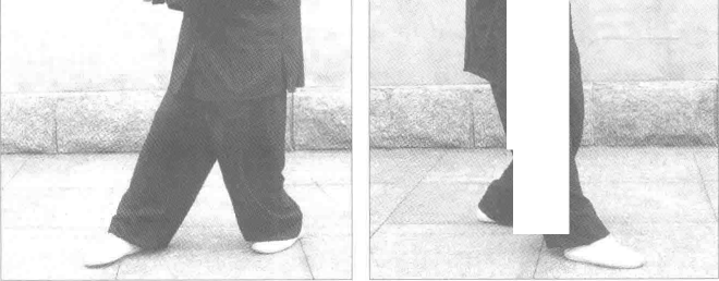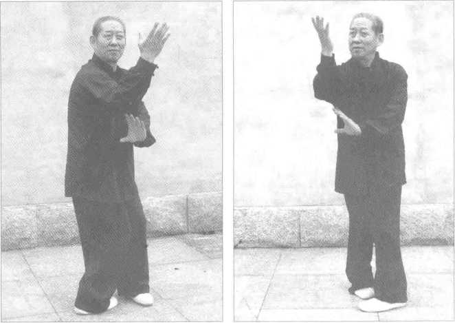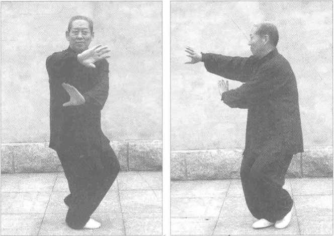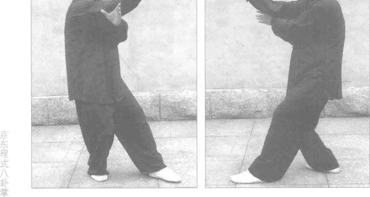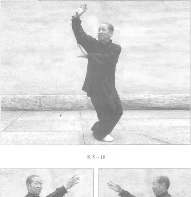 身正挺拔,下坐腰。手臂拧滚劲,大拇指朝下,小指朝上,掌朝外。 (图5-14、图 5-15)劲力手掌心里变外,手臂拧滚,掌心朝外塌,肾俞劲。京东程式八卦掌I图 5 -12图 5 - 13京东程式八卦掌I图 5 -12图 5 - 132. 程式老八掌|提掌程式老八掌|提步至筋骨处前手心朝外,后掌相随,掌不过肩,脚一实一虚。(图5-16、图 5-17)图 5-16 a 5 -17劲力脚尖提至筋骨处,手掌外翻劲。图 5-16 a 5 -17劲力手臂肩腰劲。食指腕骨合谷劲。