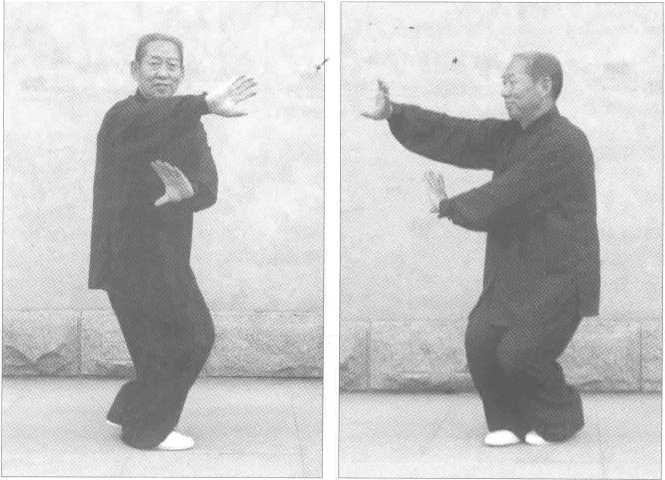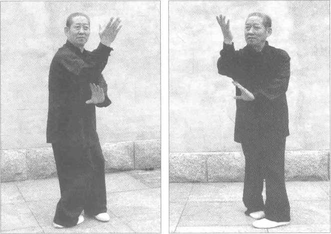 背身掌起式于单换掌。里左脚直迈,外右脚扣迈。上 身空胸拔顶,舌舔上腭。腰身往下坐,沉肩坠肘,前手掌伸出与眉齐, 眼瞧虎口,前左手塌腕,五指回反二指够目,虎口要圆,两眼不离前手。 后右手不离前臂肘,后右肘不离心口,后手肘掩心,指掌朝前跟,前后 两手共成一团神,两臂抱紧不散神。溜臀合胯,行走如蹚泥,稳如坐轿, 转动如水中漂木。