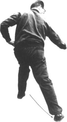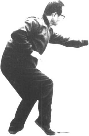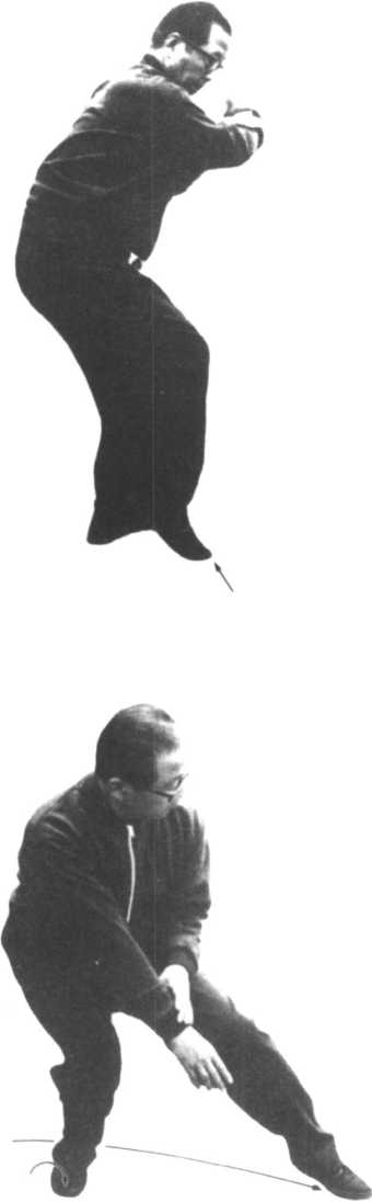 ②一口气将右足落地、负荷体重、左 足前进。两手的动作是左手仍靠着 右手,向下滑去。