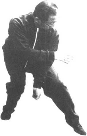 ①与前面第22式的崩捶相同。先变 左手为巴子拳,放得很低,再将右 掌靠在左手腕部。用例:以左腕、右手来封锁对方的右拳攻击。②依左足、右足的顺序各向前半步, 成半弓半马步的姿势,左腕上摆、右拳握拳靠在腰侧。酬:控织龄触腕、马上前 丨,赃轴?赖方的股间