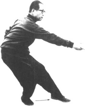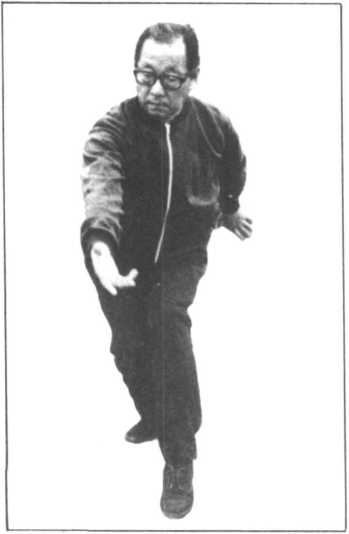 ①身体转向左侧的同时,跨出左 脚成为虚步。变手为掌,左掌 在前方下压后落于腰侧,右掌 由下绕向前方递出。用例:用左手将对方的攻击挡于 外侧而躱过,再以右手抄起 对方的股间来加以攻击。〈由正面看上式〉注意左手的位置和上半身的 扭转等。