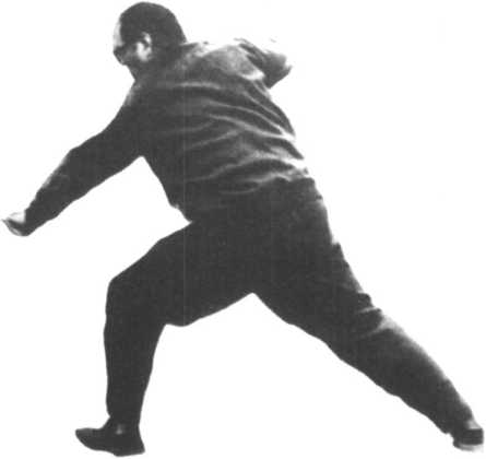 用例:配合对方的攻击,用 左手或右手来抵挡,并 用右脚来踢对方的股间 和下半身。