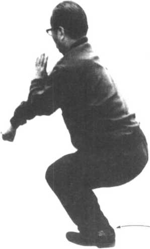 ② 右足靠向左足,两足同时 稍向前方踏出去,变左拳 为掌,收到右胸部前方。 同时,将右拳向下前方打 出去。