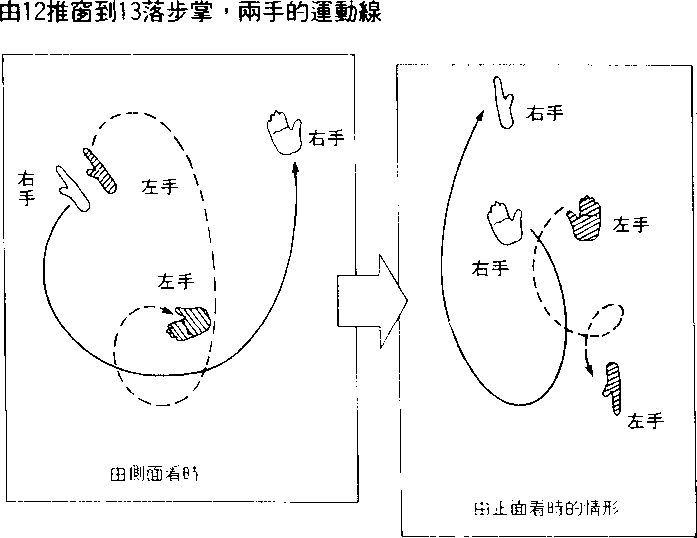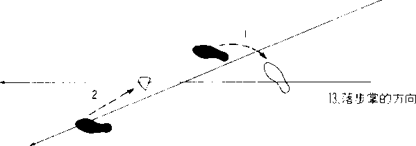 右足大步后退,稳住重 心,左足也配合右足的移动 拉回来而成虚步,右手下、 外、上大幅摆动,停放在头 上高处,左手卷向内侧下落 ,放在左膝外侧。用例:对方用手、足连续攻 击时,就用右手和左手 在外侧抵挡,还可以左 腕对抗对方踢过来的腿由12推窗到13落步掌的步法和方向1. 1?.推窗的方向1?.推窗的方向右足向后退让移重心。此时脚稍往斜内侧缩回。1?.推窗的方向1?.推窗的方向2. 随右足柊动,足也大步收回,脚跟浮起成虚步。