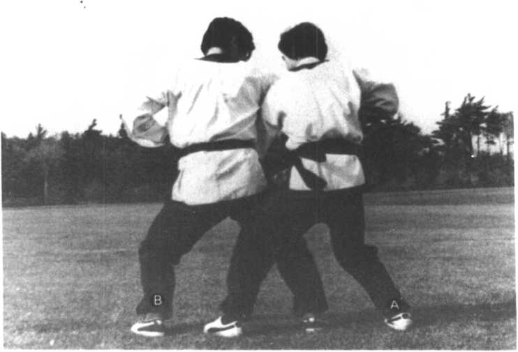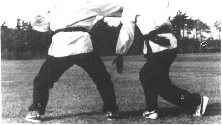 (圈 40)12921 ?〔缠丝崩捶〕①⑧马上站起来,成马步,以右拳攻击?的胸部。?扭转 右腕,将⑧的攻击排向内侧。(图40 )② ?扭腰,转踩右足,用右手捉住⑧的右腕,放下左手, 以左腕至肩的部分压在⑧的时上。(图41 )③ ?将左足又在⑧的右足之后,成马步,左手由下上摆, 由⑧的股间挑起,攻击其腹部。(图42 )