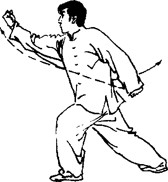 ①左转体成左弓步;右臂竖向向前擢打,右拳反转,拳眼向 右;左臂后摆,左拳反转,拳眼向右。目视前方(图2-4)。