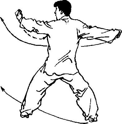 图2-5图2-5右臂擢打,左拳变掌 收回立于腹前;左脚起动 戳右脚,脚尖向上,震右 腿、上左腿,右转体,双脚 滑动成马步;左臂上挑屈 肘前顶,左拳置于左肩胛