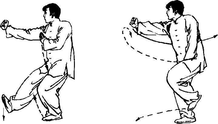 右掌变拳,双手拳眼向上;屈体下蹲,迈右脚上左脚成左虚 步;右臂下摆平举。目视前方(图2-3)。
