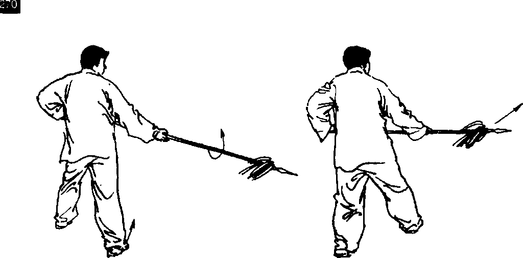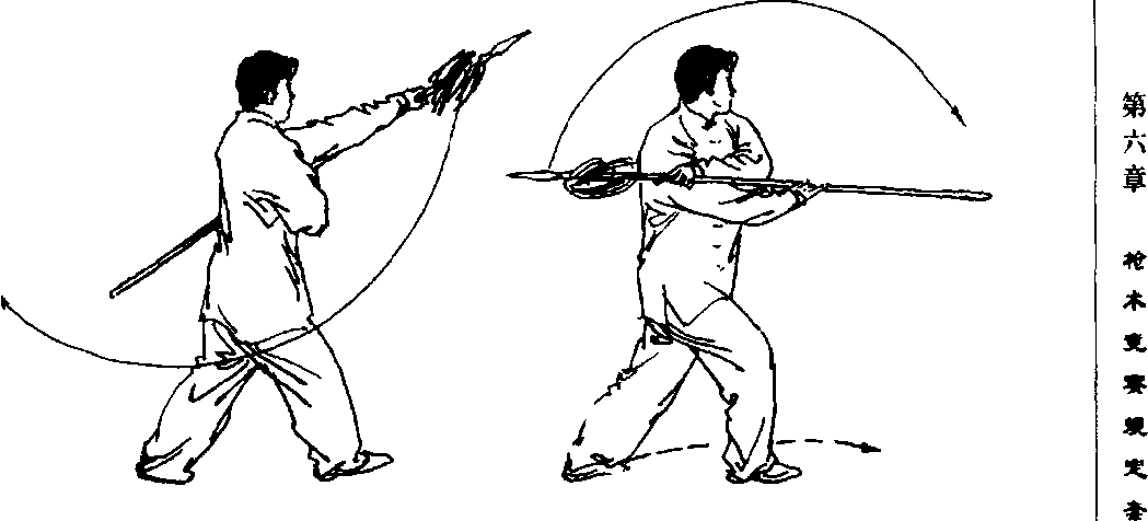 转身拦枪,右脚 起动,上左脚舞花拿 枪,成左弓步刺枪° 目视枪尖(图6- 120、图6-⑵、图 6-122,图 6-123、 图6-124底