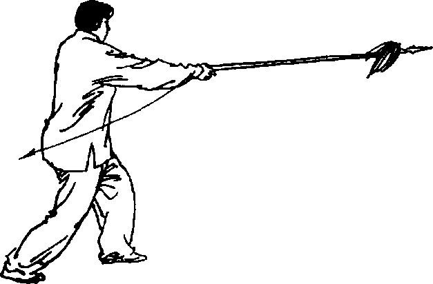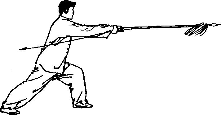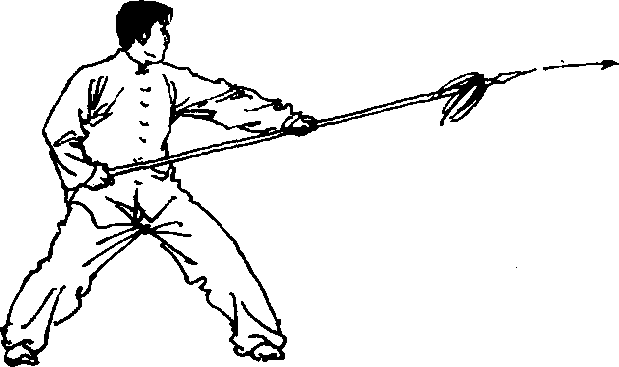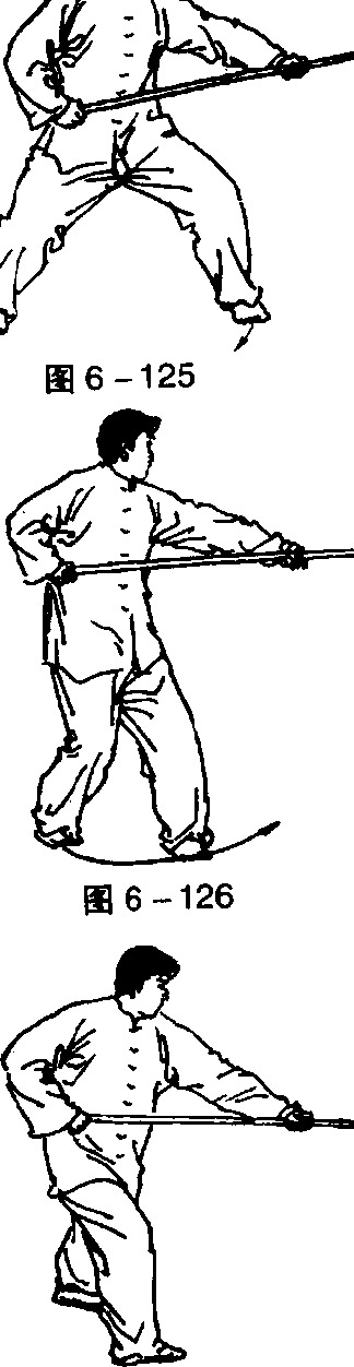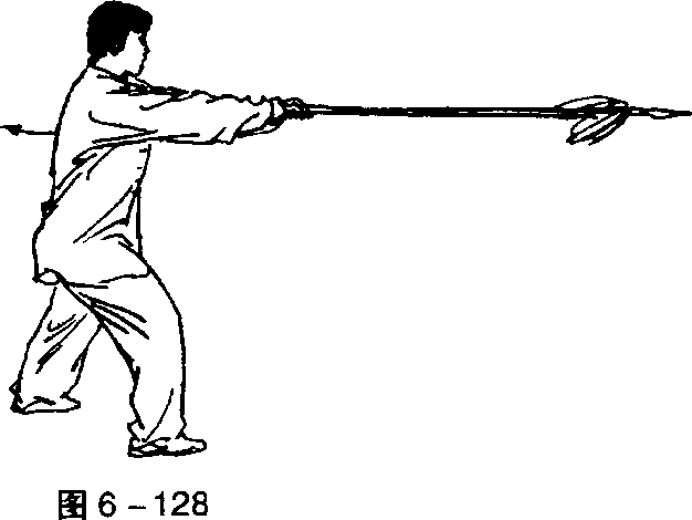 ①右手拉枪成马步持枪式,右跨左脚拿枪,迈右脚成右弓步 刺枪。目视枪尖(图6-125、图6-126、图6 - 127、图6-128)。