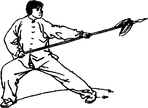 ②左手换把握枪后,将枪拉回,上右脚跨左脚,拿枪成弓步 持枪式。目视枪尖(0 6-129.图6- 130、图6-131、图6- 132) 0