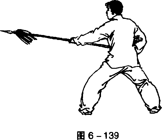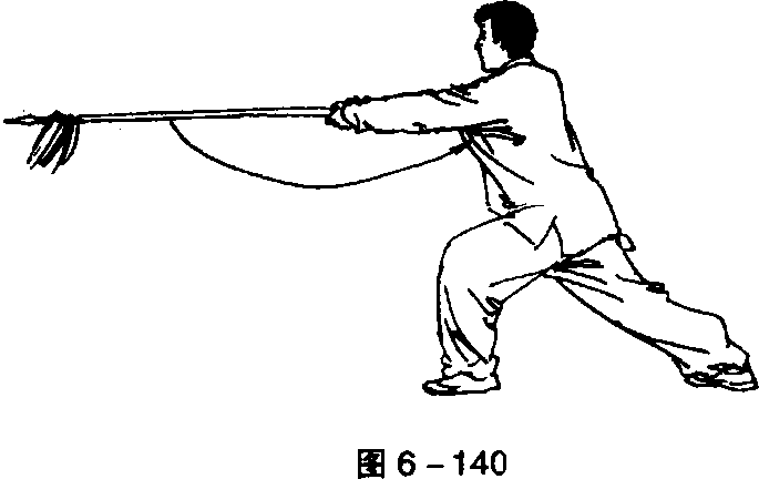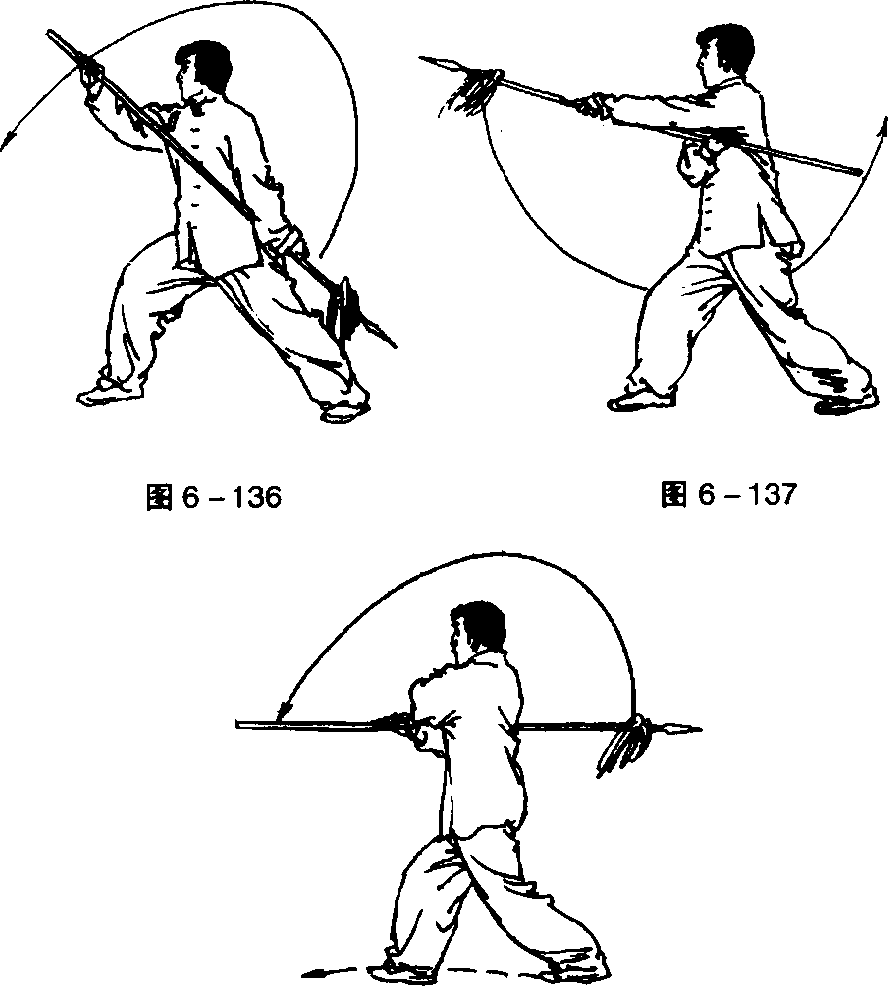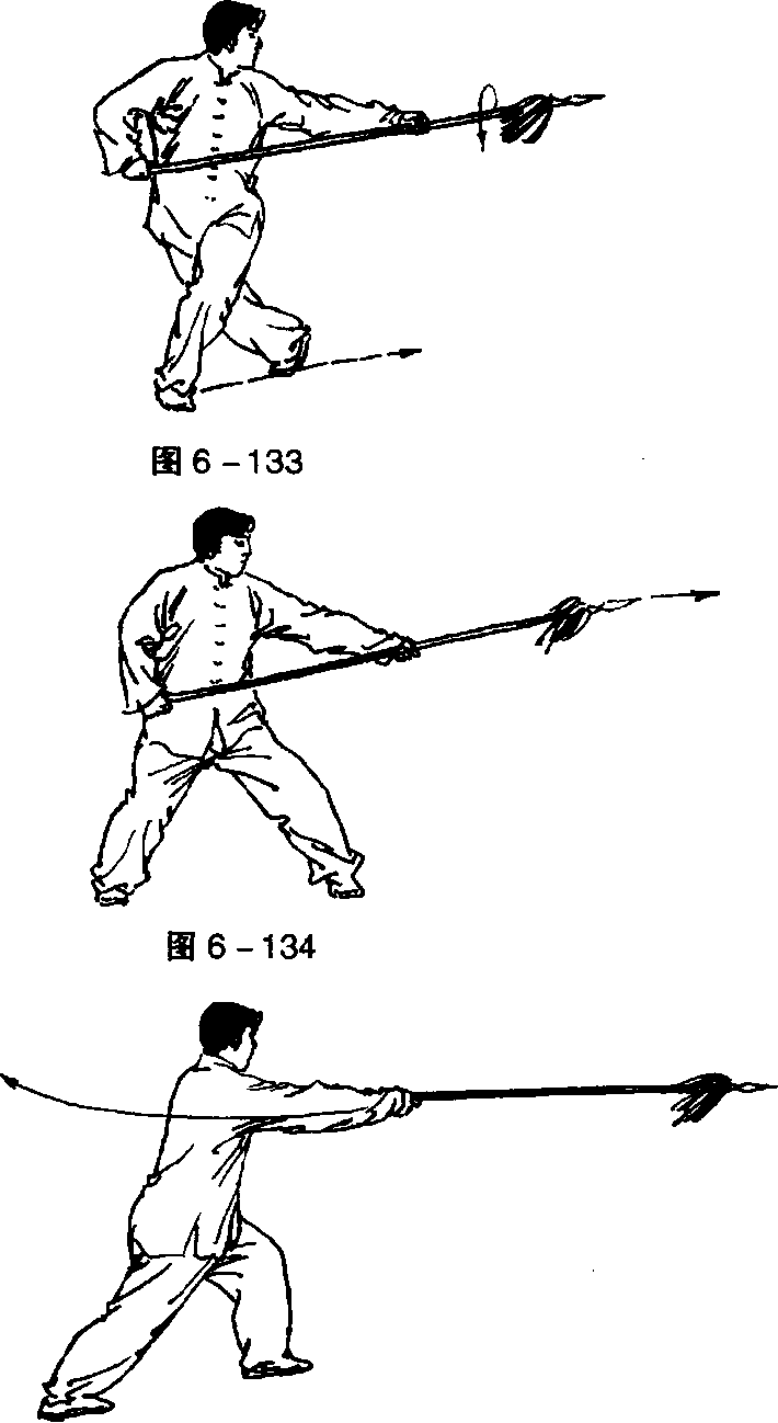 ①右手拉枪,左手直臂滑枪身,右转体成弓步持枪式(图6 - 133、图6-134)。中国武术系列规定套路②左脚向左前方迈半步,右脚后套步的同时拿枪,跨左脚左 转体成弓步刺枪。目视枪尖(图6-135)。45 .舞花刺枪转身拦枪,右脚起动上左腿舞花拿枪,成左弓步刺枪。目视 枪尖(图 6 - 136、图 6 - 137、图 6-138、图 6 - 139、图 6 - 140)。第六t枪木嵬*?,火套路第六t枪木嵬*?,火套路第六t枪木嵬*?,火套路第六t枪木嵬*?,火套路中国武术系列规定套路中国武术系列规定套路中国武术系列规定套路中国武术系列规定套路