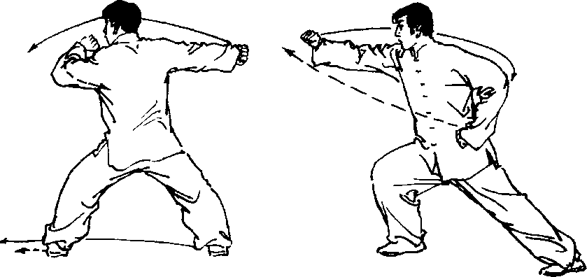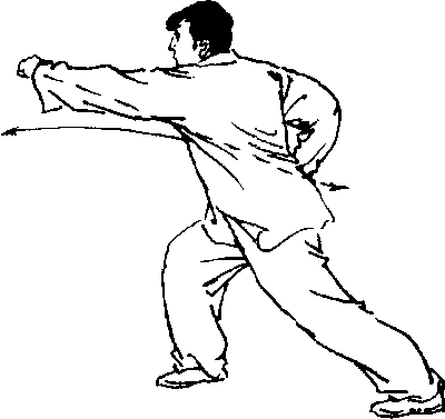 ①左转体,起动左脚上右脚成右弓步;右拳向前直臂横拽, 拳眼向左(图2-9)。