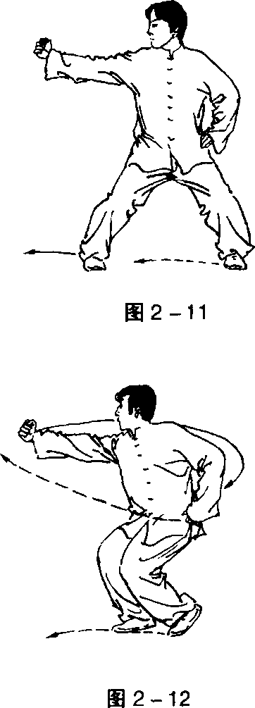 ③左转体,双脚碾地成马步,右拳平击出,拳眼向上,左拳拉 回置于左侧腰际,拳眼向上.目视右手(图2-11)。