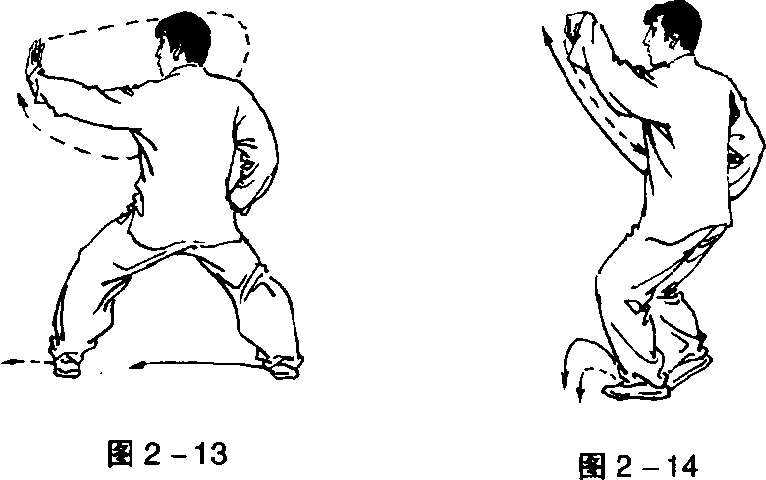 起动右脚上左脚, 右转体,双脚碾动成马 步;左手变掌,向前平推 出,掌心向前;右手变掌 拉回置于右侧腰际,掌 心向下。目视左手(图 2 - 12、图 2-13)。