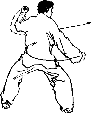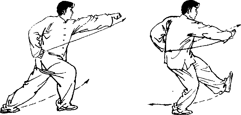 右转体成右弓步;左拳由腰际平击出.拳眼向右;右拳拉回 置于右侧腰际,拳眼向上,目视左拳(图2-31)。