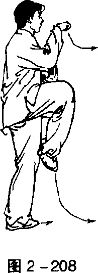 起动左脚上右脚,提右膝;屈右臂,挑顶于胸前,拳眼朝左,右 手立掌配合置于右肘左侧。目视前方(图2-208)。