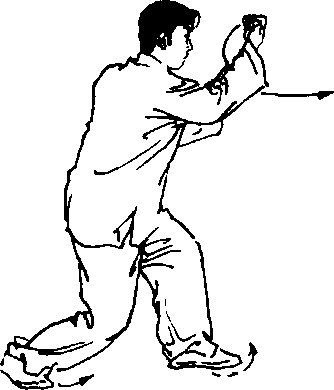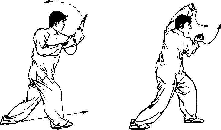 松臂下垂;起动左 脚跟右脚,滑步成跟提 步;右手变拳,于右肋间 向前击出,手心朝上,左 手配合抱于右臂肘侧。 目视前方(图2-213)。