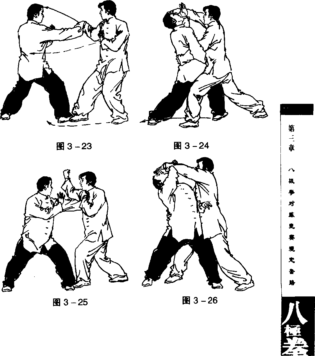 乙:右手拨开甲的左掌,顺势推击甲的右肩窝,后撤左腿成马 步;左手掌拉回左肋侧(图3-23、图3-24、图3 - 25、图3-26)。