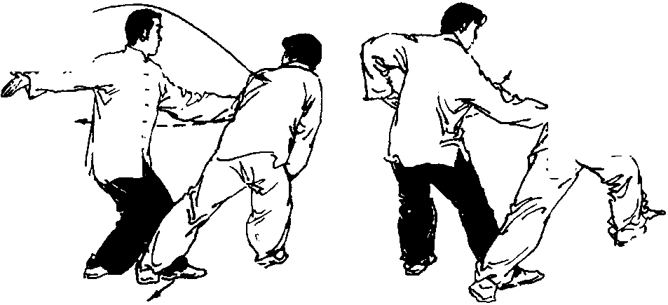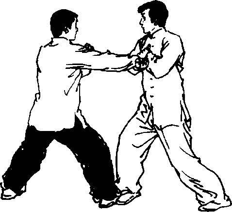 甲:右手在下,左 手在上,合捧乙的右手 于胸前,使乙的手置于 右手腕上侧,两手心向 下;震右脚,左转体,上 左腿置于乙的右腿后. 左手腕转缠乙的手腕;