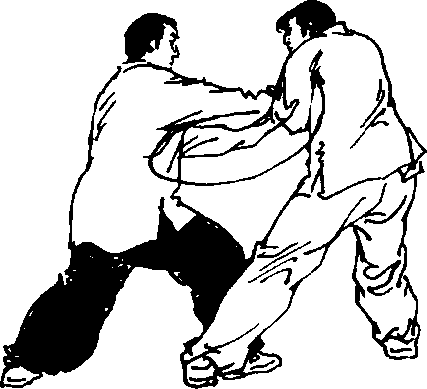 甲:右手反刁乙的 右手腕;震右脚,上左脚 于乙的右腿后,上左臂屈 肘缠压乙的右臂,捆抱 乙的后腰,右掌击打乙的 面部;
