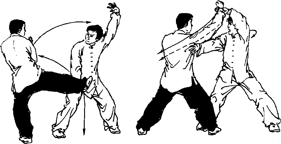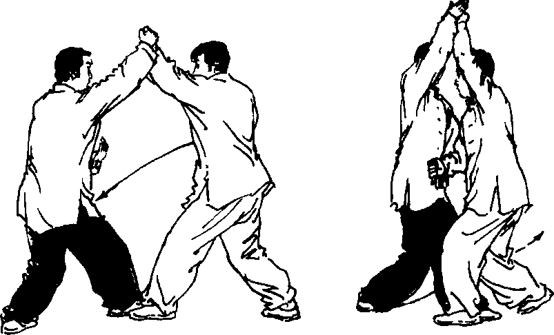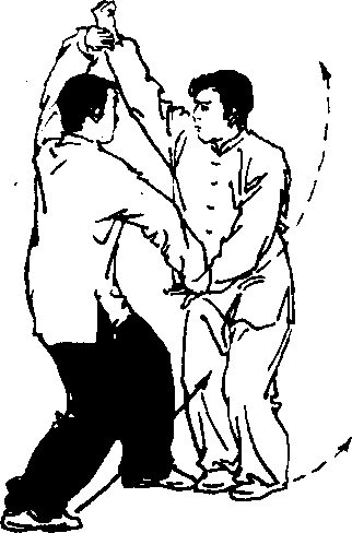 乙:左转体,右手掖下甲的左臂置于小腹前,左手变掌,云拨 甲的右掌,置于头上方前侧,起动右脚左脚跟上,屈体成并步;