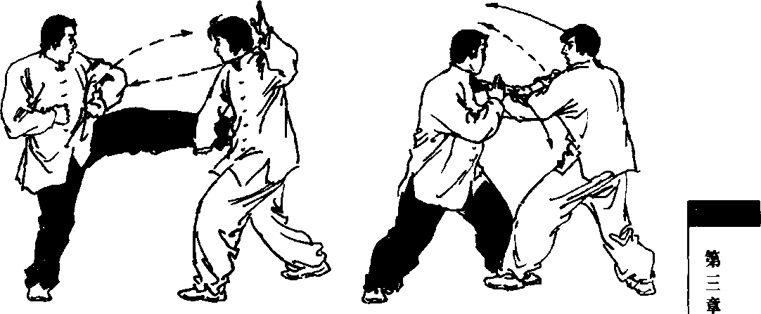 甲的右臂将乙的左 臂撩起;乙撤左脚,左转 体,抡劈右臂于甲的头上 方,左掌收于右肋例;甲 的左前臂接架乙的右前 臂,起动右脚上左脚成跪 膝步,右拳击打乙的小腹 (图 3-37、图 3-38、图 3-39)。