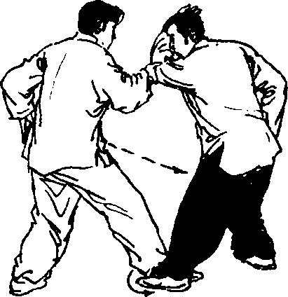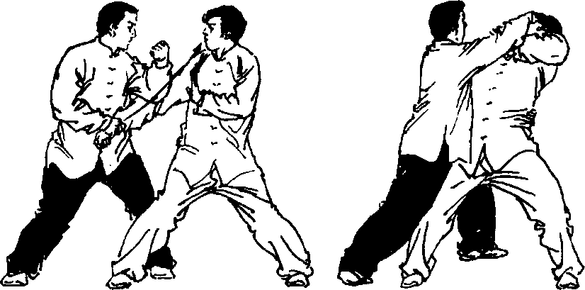 乙:左掌反扣按扶 甲的左手置于胸前,震 左脚于甲的左腿后,上 右臂屈肘缠压甲的左 臂,捆抱甲的后腰,左掌 击打乙的面部;