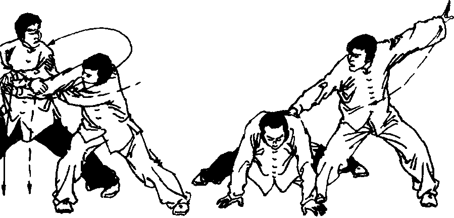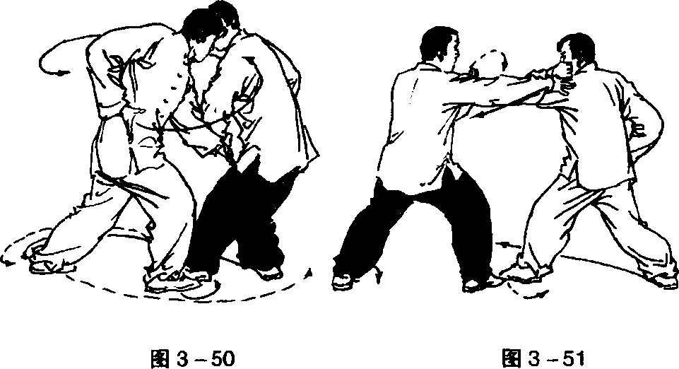 甲:右臂随乙缠力的方向 向里反转,左掌由下横拨乙的 左肘,使乙的双手松开,右手 抡劈乙的后背,右腿横撤步挂 乙的左腿,使乙双手扑地(图 3 -57、图 3 -58、图 3-59)。