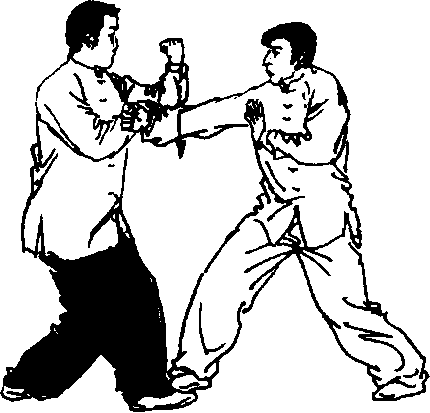 于右手腕上侧,两手心向下; 震右脚右转体,上左腿置于甲 的右腿后,右手腕转缠甲的手 腕;