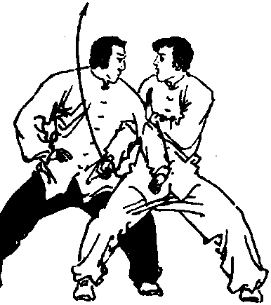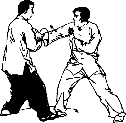 甲:右手拨开乙的左掌,顺势推击乙的右肩窝,后撤左腿成 马步,左掌拉回置于左侧肋间(图3-52、图3 - 53、图3-54、图 3-55、图 3-56)。