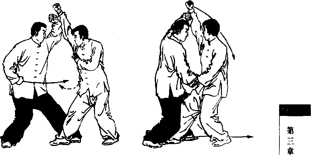 甲:右转体成右弓步;抽回右拳,置于右侧腰际,左手变拳横 拽乙的右侧,拳眼朝里;