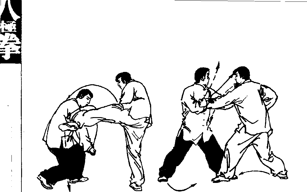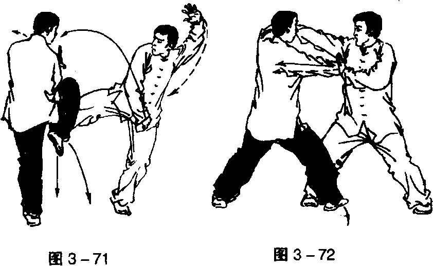 乙:撤右腿,提右膝,右掌劈砸甲的右脚,左掌立于右肩侧; 落右脚,双脚向左滑动成马步,右掌反拍甲的右肋侧,掌心向左, 左手接拿甲的右手腕置于头左侧,掌心向外(图3-71、图3- 72) o