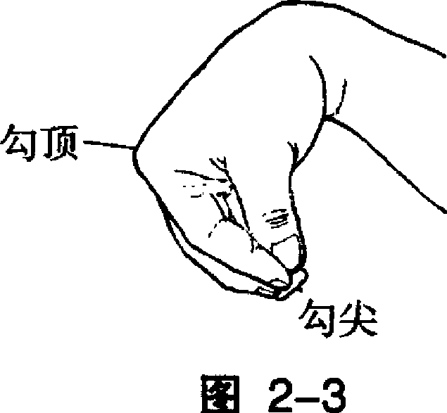 五指撮在一起,腕关节弯 曲称为勾。(图2-3)